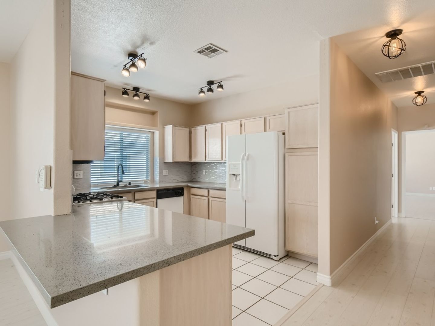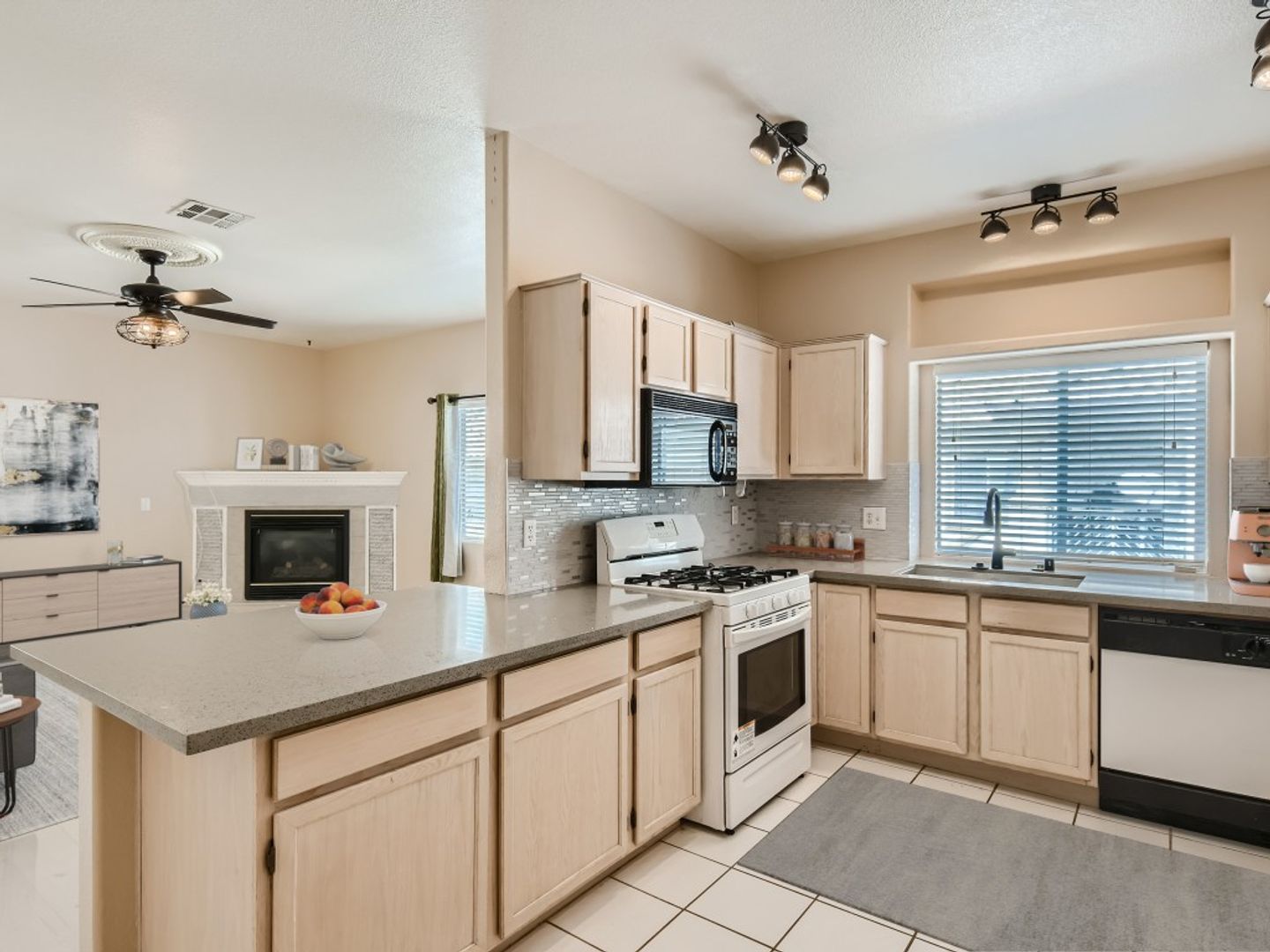 AMAZING COMPLETELY REMODELED 2 Bed 2 Bath Condo with a 2 Car Garage- door to garage is right under the stairs! Private entry with no sharing with the neighbors! SECOND floor,CORNER unit is very QUIET and PRIVATE. *NEW* fresh luxury paint * NEW* sparkling granite counters in kitchen and bathrooms * NEW* deluxe fixtures throughout the home * NEW* WASHER and DRYER included in a separate laundry room. Ice cold CENTRAL AIR. Modern FIREPLACE updated with DESIGNER tile in the family room. Spacious balcony to enjoy the weather and sunsets. POOL and CLUBHOUSE nearby. Near Centennial Shopping Center, Painted Desert golf course and the Santa Fe Casino. The PERFECT place to call home! This unit will not last. Act fast!