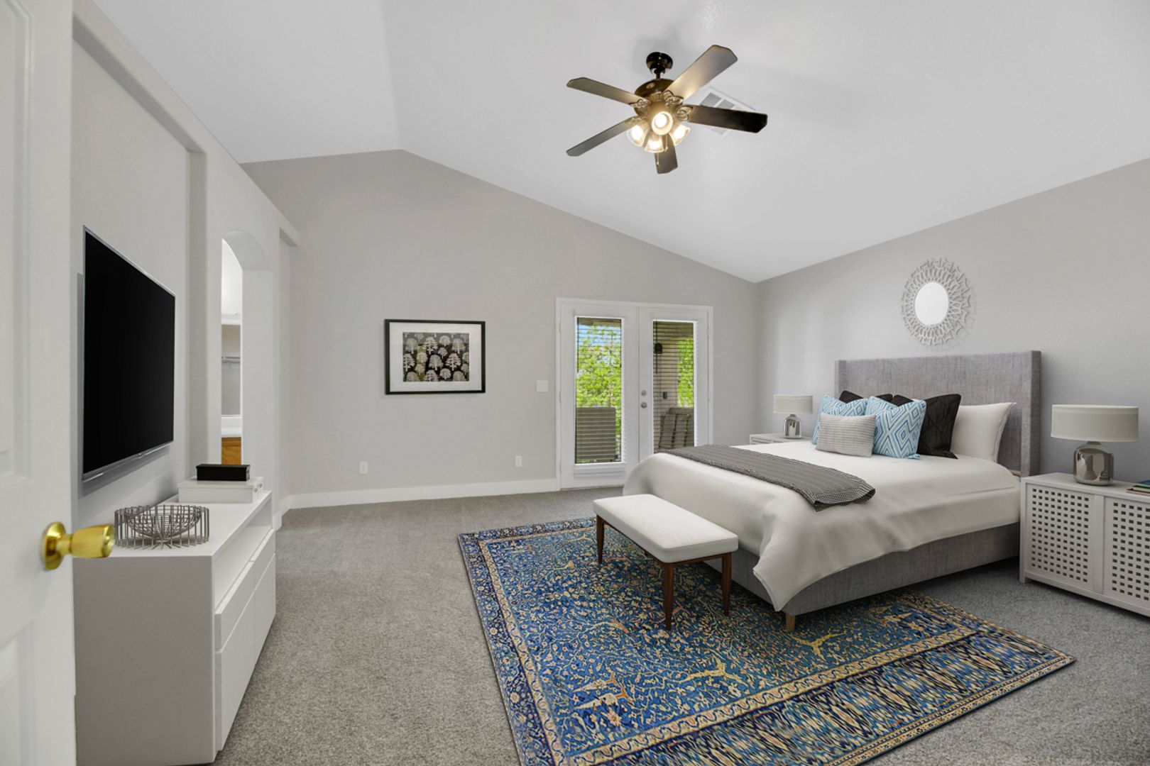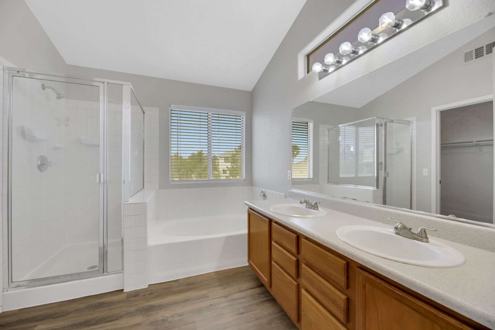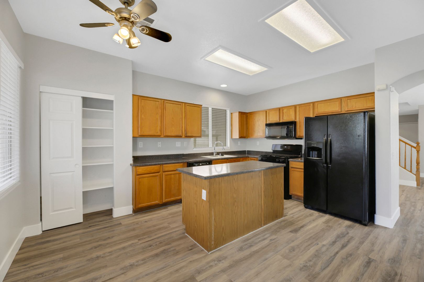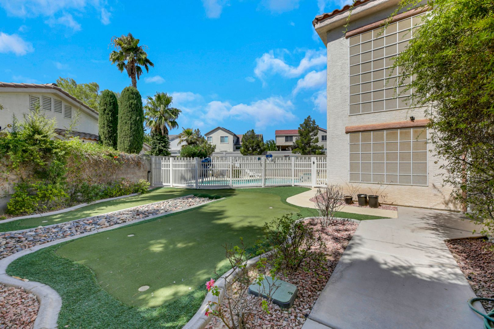 Fantastic 4 bedroom home with a large back yard including a fenced in pool and spa, and putting green. Remodeled with new paint, luxury vinyl flooring, baseboards, and blinds. Ceiling fans throughout. Features a double-sided fireplace for the living and family rooms as well as a spiral staircase leading from master to covered patio.