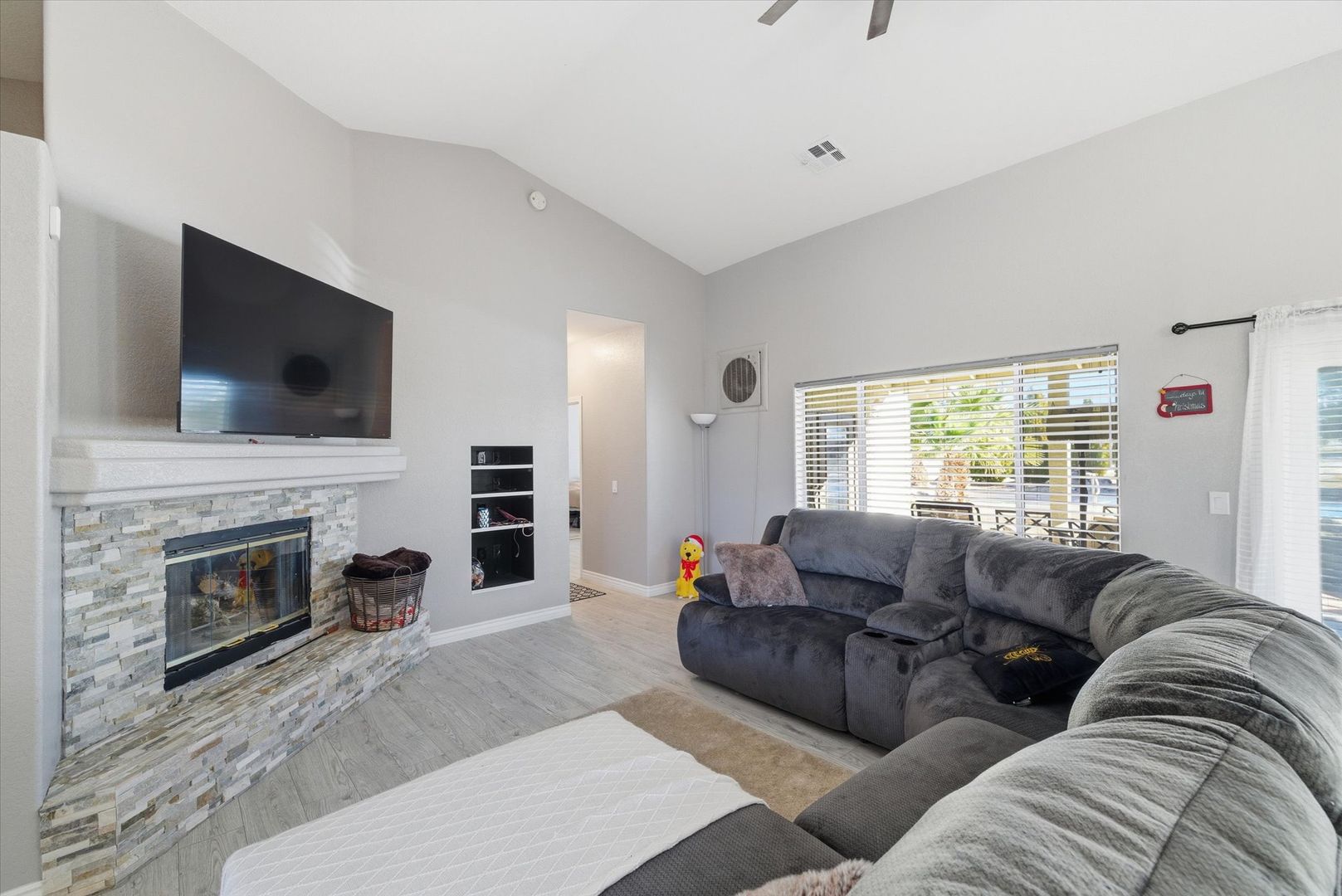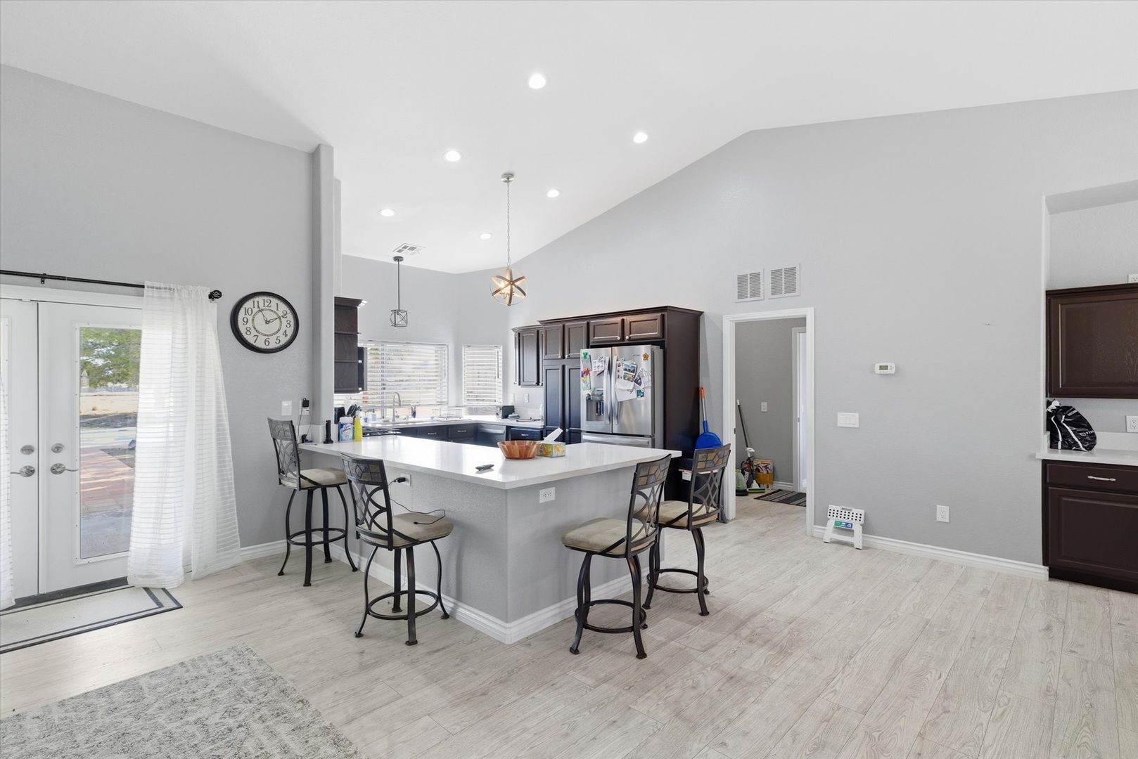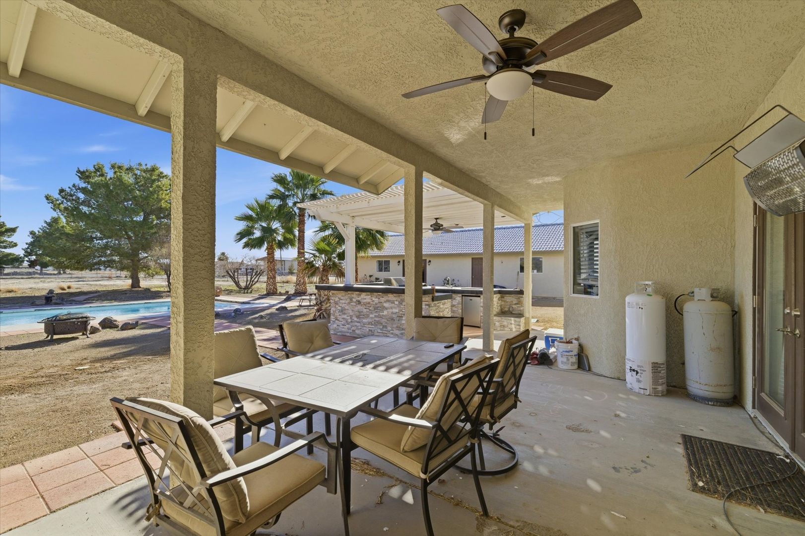 Situated on a spacious 1.4-acre lot with mountain views, this beautifully updated home offers a perfect balance of modern design and comfortable living. The living area features vaulted ceilings, a fireplace, wood-look tile flooring, and French doors that open to the backyard. The kitchen features stainless steel appliances, quartz countertops, a breakfast bar, complemented by a dining area with a built-in buffet. The primary suite includes direct backyard access and a well-appointed ensuite. Three additional bedrooms provide flexibility, including a fourth bedroom with a walk-in closet and access to the utility room. Designed for entertaining, the expansive backyard features a covered patio, sparkling pool, built-in BBQ, water feature, and horseshoe pit. Pool house attached to garage not included in rental & will be used as storage for owners belongings. Pets considered on case by case basis. $175 admin fee due at move in. Pool maintenance of $140/ month included in rent.